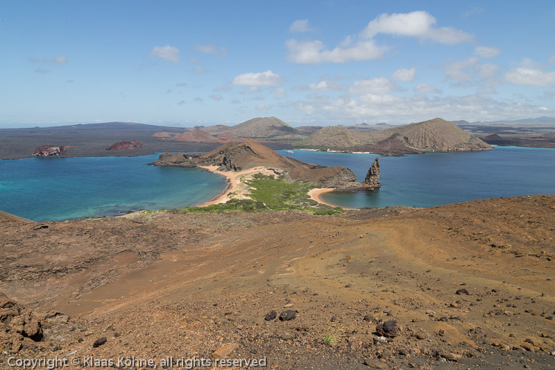 So, hier mal mit Weitwinkel und ohne Leute. Im Vordergrund Bartolomé mit dem Pinnacle Rock und der doppelten Strandbucht, im Hintergrund ist die Vulkanlandschaft der Insel Santiago zu sehen.