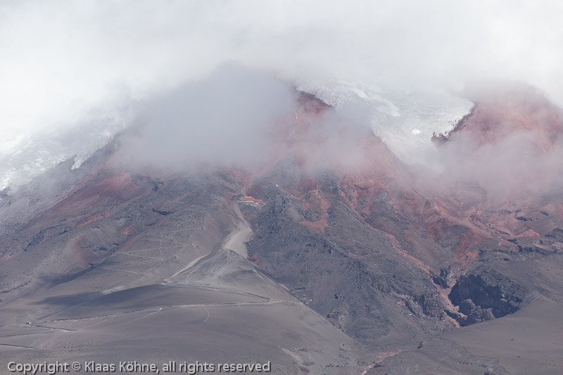 Mit dem Tele erkennt man das neue Refugio Ribas, das noch rund 1000m höher liegt.