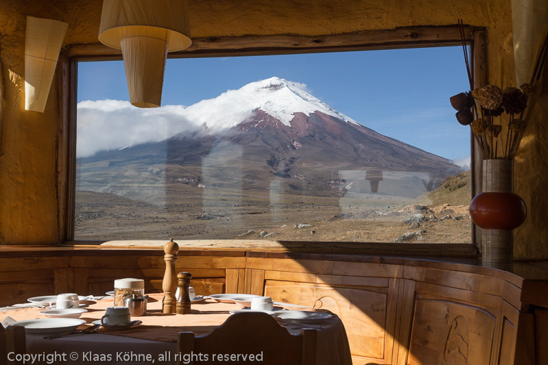 Frühstück mit Aussicht in der Tambopaxi-Lodge. Nein, das ist kein Wandbild...