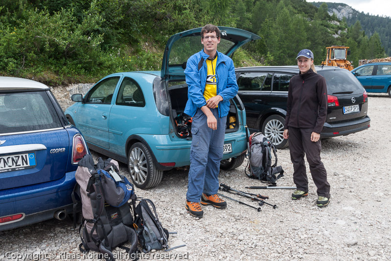 Mit Franzi und Mark am Parkplatz beim Lago di Fedaia auf 2068m Höhe (geschätzt). Leichter Regen - das fängt ja gut an...