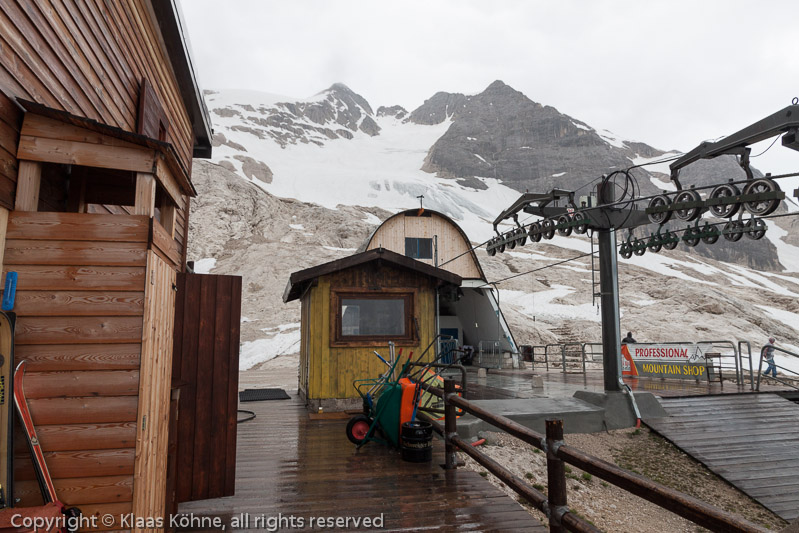 Um halb sechs sind wir oben am "Rifugio Pian dei Fiacconi" auf 2626m. Nicht zu früh - es fängt schon an zu grummeln. Im Hintergrund lockt/droht die Marmolada. Tja, was werden wir morgen dort erleben? PS: Als überzeugte Puristen haben natürlich NICHT die Gondel genommen...