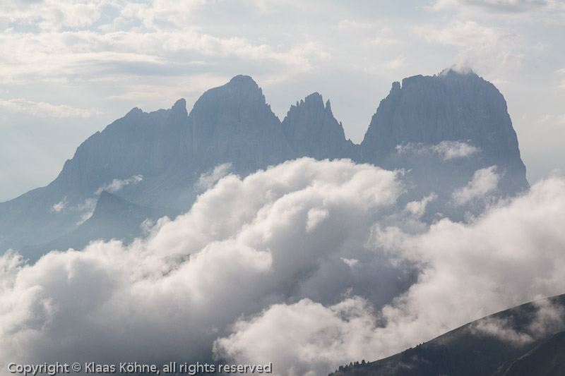 Teleaufnahme mit (von links) Plattkofel, Zahnkofel, Grohmannspitze, Fünffingerspitze und ganz rechts dem Langkofel himself (3181m). Ostern 2002 war ich immerhin auf dem Plattkofel. Die anderen Kameraden sind wohl jenseits meiner Möglichkeiten...