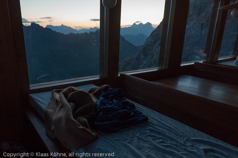 Am nächsten Morgen gegen halb sechs. Für eine Hüttenübernachtung war das hier sehr komfortabel. Am Horizont grüßen die drei Tofanen.