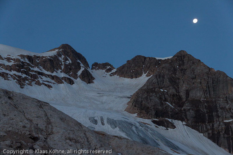 Gang vor die Tür: links die Punta Rocca (3309m), halbrechts die Punta Penia (3343m), unser Ziel. Man kann schon das Gipfelkreuz erkennen. Und als Zugabe beleuchtet der Mond die beeindruckende Szenerie.