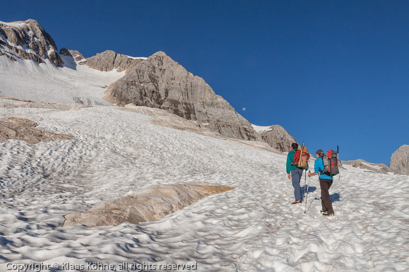 Um Viertel vor sieben kommen wir los. Zuerst geht es über schneebedeckte Gletscherschliffe.