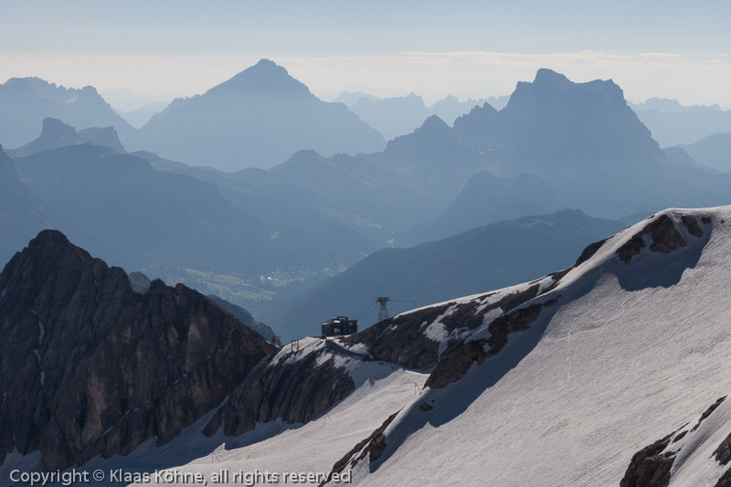 In der Ferne sind der Antelao (3264m) und der Monte Pelmo (3168m) aufgetaucht. Im Vordergrund die hässliche Mittelstation der Marmolada-Seilbahn.