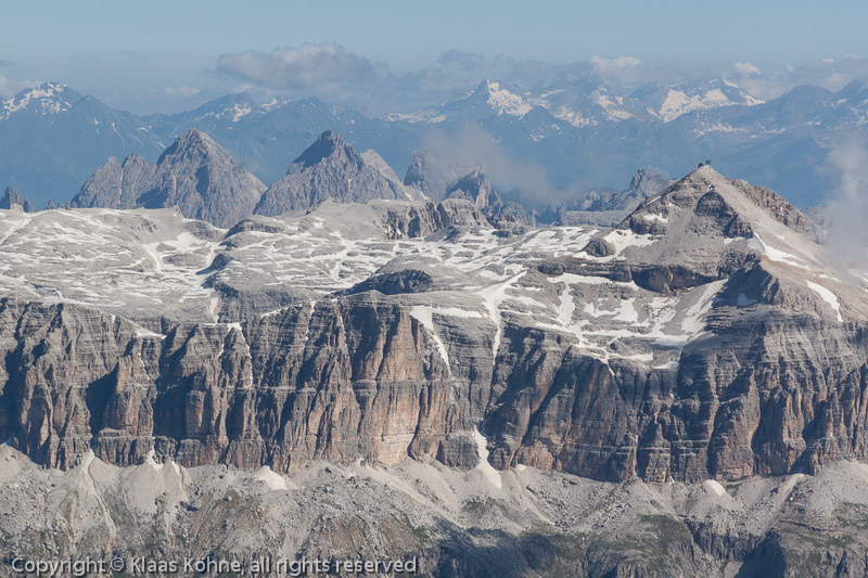 Ein interessantes Ensemble: im Vordergrund das Sella-Plateau mit der Pyramide des Piz Boé (3152m), dann halblinks die Geislerspitzen mit Sas Rigais (links) und Furchetta (rechts, beide 3025m) und schließlich im Hintergrund der Alpenhauptkamm mit Vertretern der Zillertaler Alpen