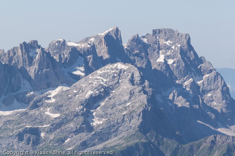 Deshalb nochmal im Detail. Etwa in der Mitte die Cima della Vezzana (3192m), die übermorgen hoffentlich so nett ist, mich auf ihren Gipfel zu lassen. Rechts der berühmte Kamm des Cimon della Pala (3184m), dessen Besteigung allerdings jenseits meiner Fähigkeiten und Ambitionen liegt.