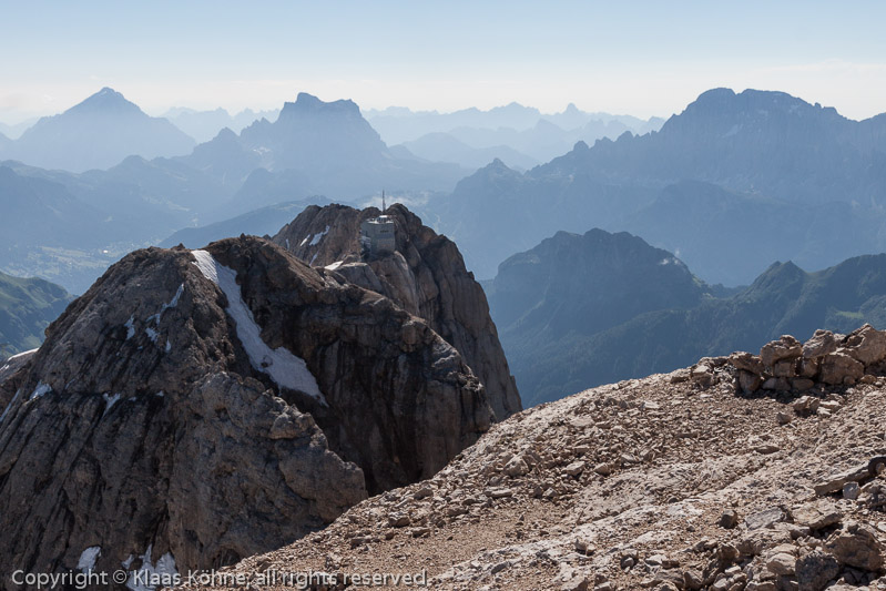 Die Punta Rocca mit Gipfelstation. Im Hintergrund Antealo, Pelmo und neu die Civetta (3220m) - drei absolute Solitäre der Dolomiten.