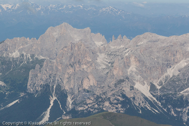 Deutlich tiefer als unser Standpunkt liegt die Gruppe des Rosengartens mit der Rosengartenspitze (2981m, links) und den drei Vajolet-Türmen (bis 2813m, rechts).