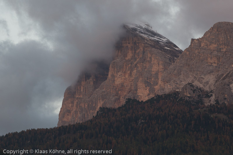Blick zur Tofana di Rozes (3225m) um halb acht: Sieht nur bedingt einladend aus...