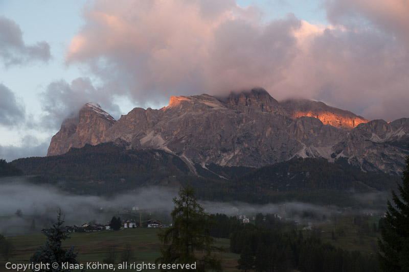 Aber es wird heller und die ersten Sonnenstrahlen erreichen das Tofana-Massiv.