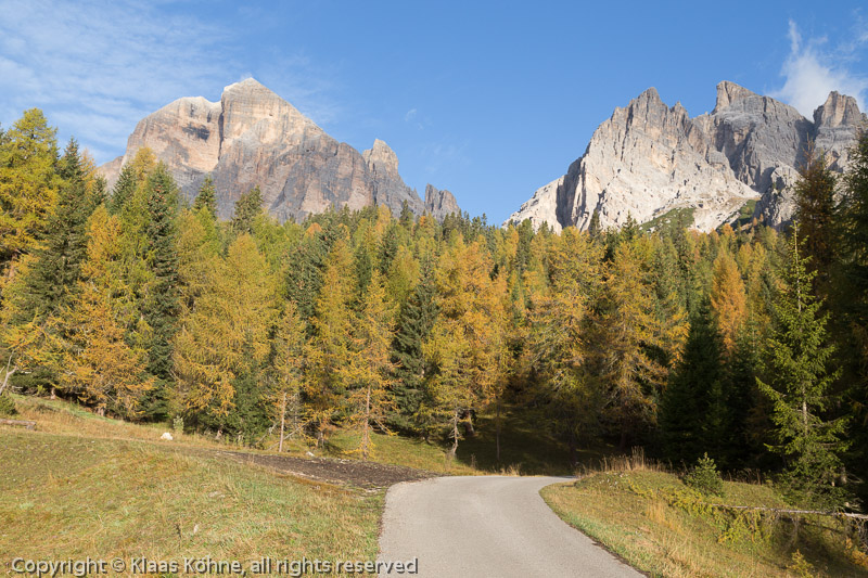 Auf (zunächst) guter Straße geht es aufwärts zum Rifugio Dibona, das jetzt im Oktober aber schon geschlossen ist. Links die Tofana di Rozes, rechts die Tofana di Mezzo (3244m).