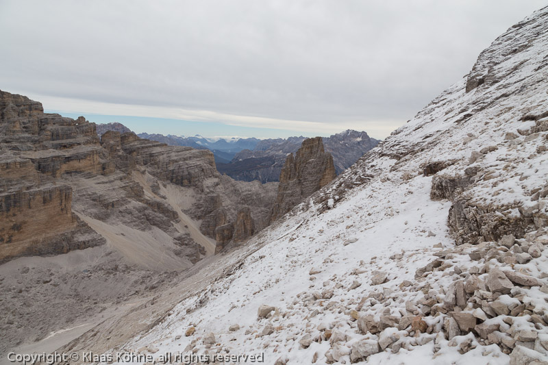Also behalte ich die Eisen an und taste mich vorsichtig die "Tofana-Terrassen" aufwärts. Eine Vierergruppe kommt zügig vom Gipfel herunter. Nicht alle haben Steigeisen an den Schuhen. Also, ich gehe hier jedenfalls nicht "ohne" rauf.