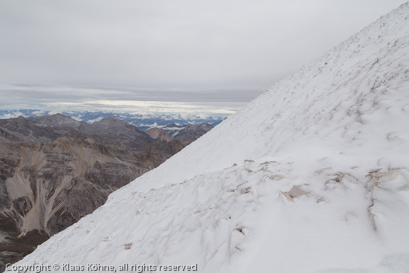 Diesen vereisten Hang ohne Steigeisen hinauf? No way! Entweder waren die vorhin sehr leichtsinnig oder sehr gut. So, wie sie abgestiegen sind, vermute ich letzteres.