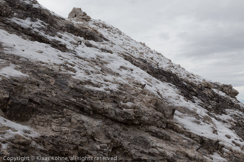 Ich hoffe, man erkennt, dass das Gelände ganz schön heikel ist, jedenfalls für einen Flachlandtiroler wie mich. Festhalten geht praktisch nirgendwo und die Eisenkrampen im Fels nutzen mir ohne Seil natürlich wenig. Besonders die vereisten Stellen strapazieren nach wie vor mein Nervenkostüm.