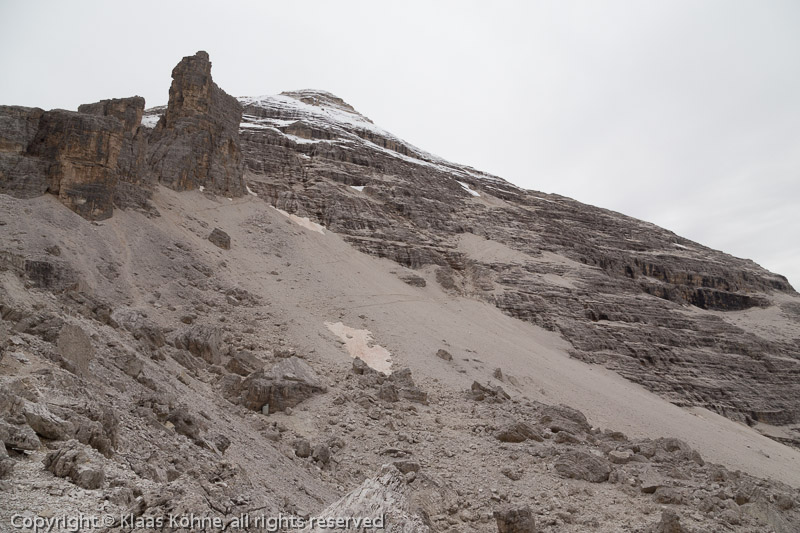 Um kurz vor fünf liegt der ruppige Teil des Abstiegs hinter mir. Der Blick geht hinauf zur Gipfelregion. Mir ist klar, dass die Sache auch ganz anders hätte ausgehen können. Ich empfinde kaum Freude über das Erreichen des Gipfels, denn dabei hat die Vernunft gegen den Sturschädel verloren. Und das sollte sie eigentlich nicht...