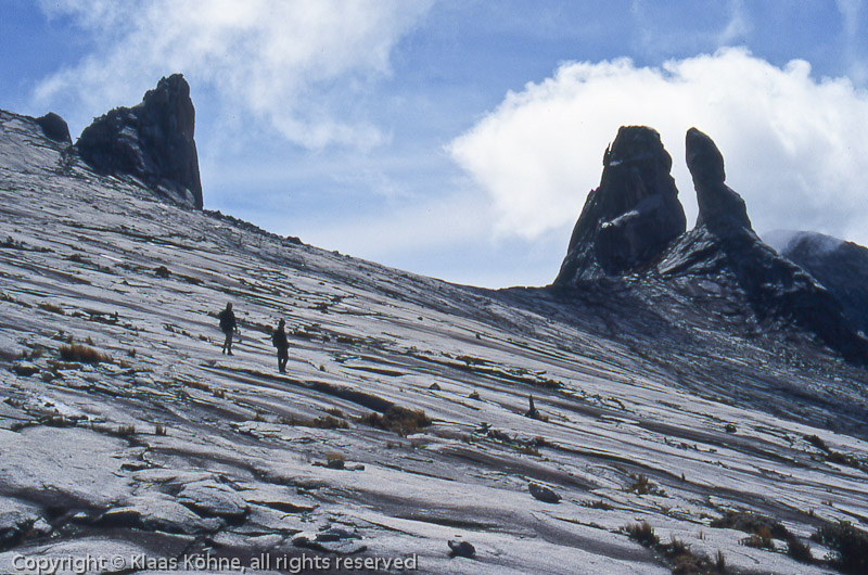 In der Gipfelregion des Mount Kinabalu. Hinten rechts die 4055m hohen "Donkeys Ears", links die "Ugly Sister", 4032m.