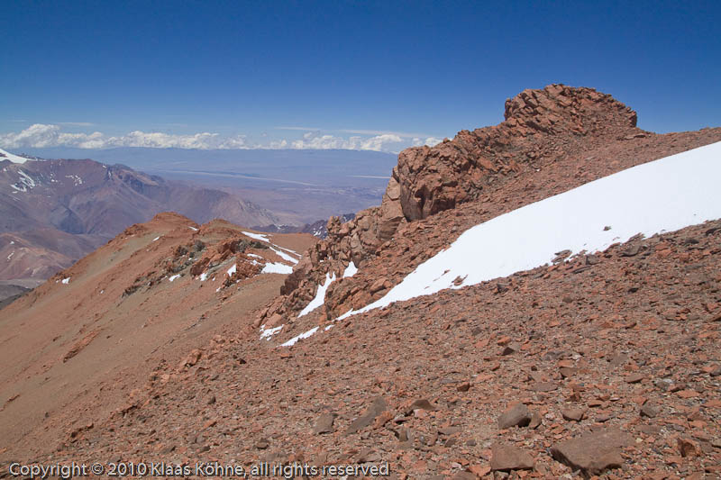 Nach übler Schinderei endlich oben am Grat auf rund 6500m. Der Verhauer hat mich locker ´ne Stunde gekostet, Mist!