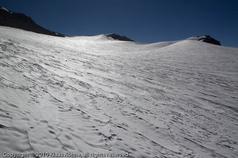 Abstieg über den Olllada-Gletscher, eigentlich mehr ein Firnfeld. So kommen die Steigeisen doch noch zum Einsatz.