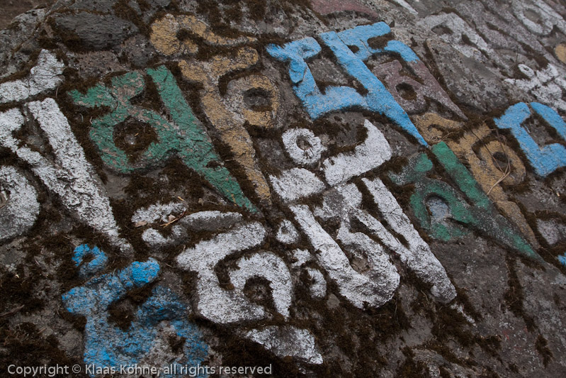 Tibetische Zeichen am Wegesrand. Ein bisschen hat es was von Graffiti...