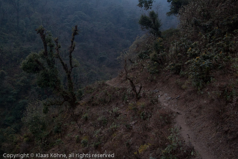 Ich biege rechts ab. Eine Spur gibt es immerhin. Nach einer etwas heiklen Bachquerung geht es auf der anderen Seite aber bald nicht mehr weiter. Und es wird langsam dunkel. Verdammich! So entstehen Unfälle. Alter, bleib konzentriert und mach´ keinen Mist jetzt!