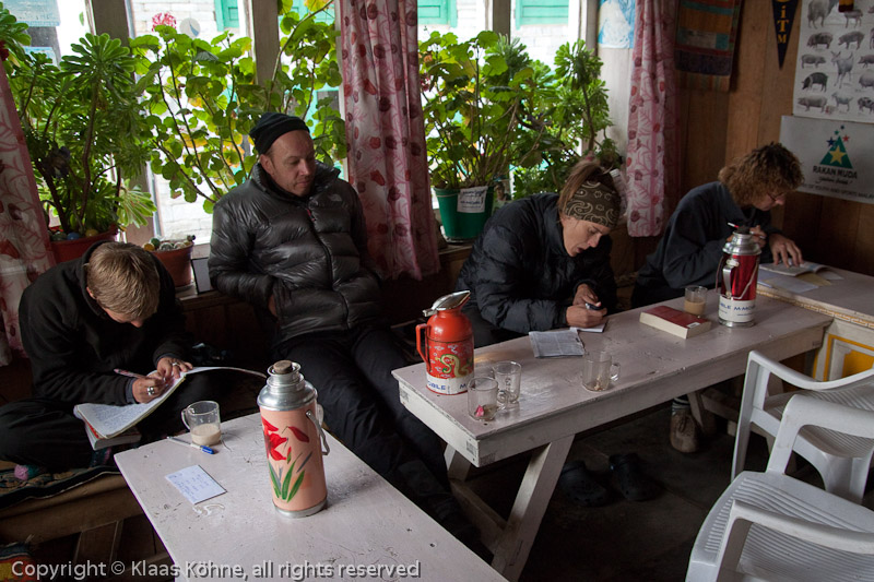 Um kurz vor halb vier bin ich in Bupsa. Genug für heute. Die anderen sind schon länger da und schreiben eifrig in ihren Tagebücher. Bernhard ist offenbar schon fertig. Philippe ist nicht hier, dafür hat sich uns ein nettes Pärchen aus Australien angeschlossen. Kurz hatten wir die beiden schon in Kinja gesehen. Sue und Howard sind echte Nepal-Veteranen und haben auch diese Tour schon mal absolviert.