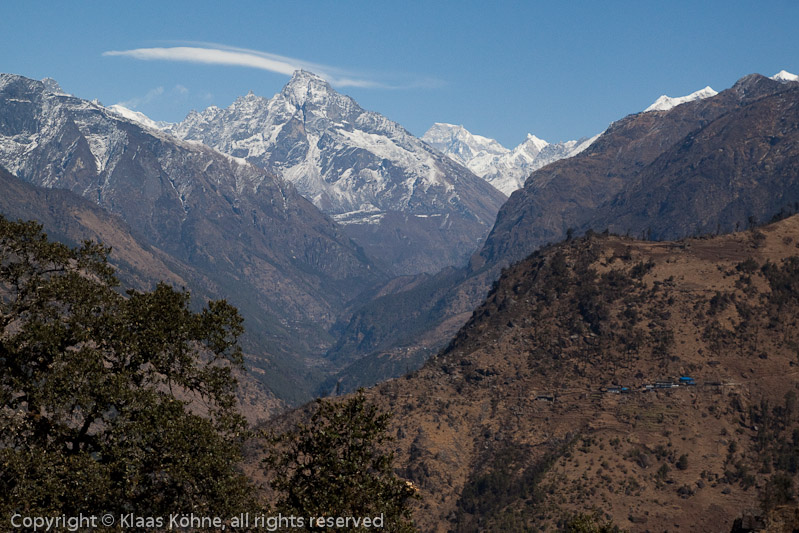 Ein neues Panorama tut sich auf! In der Mitte der heilige Berg der Sherpas, der Khumbu Yul Lha (5761m). An seinem Fuß liegt Namche, das große Ziel. Und ganz links in der Ferne...