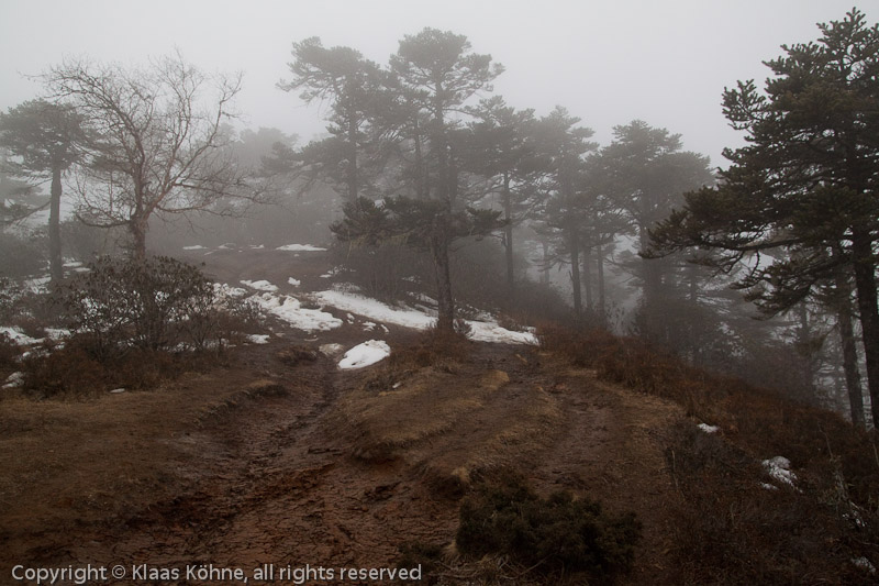Es wird Zeit, wieder nach Namche zu gehen. Zuerst über einen supermatschigen Hügel. Ohne Stöcke hat man fast keine Chance.