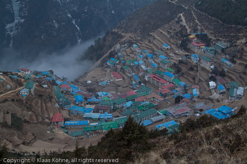 Das Namche-Hufeisen. Rechts oben das Kloster. Ein recht "spezieller" Ausflug geht zuende. Morgen steht dann die Etappe nach Tengboche an. Zwar eine relativ kurze Strecke, aber mit meiner "Wolke" auf dem Rücken wird´s trotzdem anstrengend werden. Aber dafür geht es jetzt RICHTIG in die Berge...