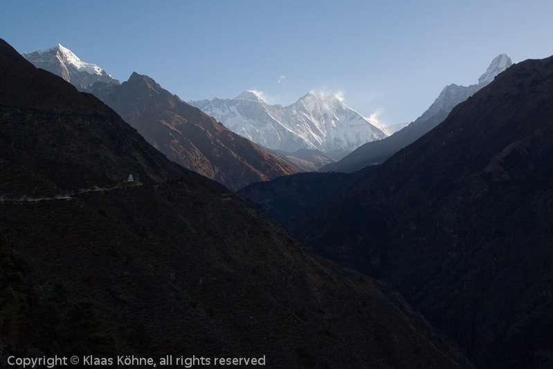 Der Weg führt um eine Ecke - und da sind sie! Links der Taboche (6542m), rechts die Ama Dablam (6856m) und in der Mitte das Dreigestirn aus Nuptse (7879m), Lhotse (8516m) und der Spitze des Mount Everest (8848m). Vor zwölf Jahren stand ich schon einmal hier und der Anblick haut mich noch genauso aus den Socken wie damals...