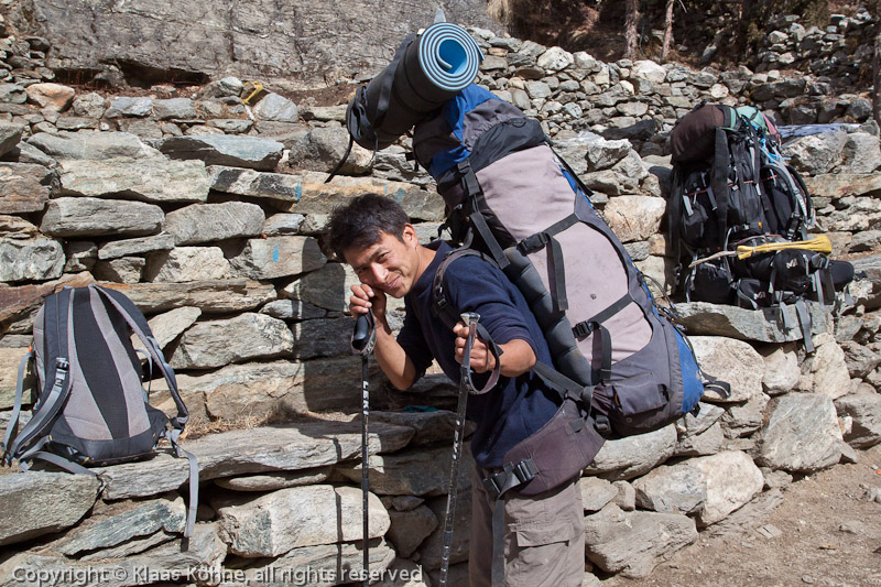 Das ist Bishru aus Kharikhola. Da wir dieselbe Strecke und auch ungefähr dasselbe Tempo haben, begegnen wir uns jeweils, wenn der andere gerade eine Pause macht. Schließlich machen wir eine zusammen und erzählen uns ein bisschen was. Er ist gerade als Träger für eine japanische Gruppe unterwegs. Bevor es weitergeht, setzen wir uns spaßeshalber mal die Last des anderen auf den Rücken. Natürlich trägt er mehr als ich durch die Gegend, aber er zeigt auch durchaus Respekt für meine "Rucksackwolke". Ob aus reiner Höflichkeit, werde ich nie erfahren. War jedenfalls eine schöne Begegnung...