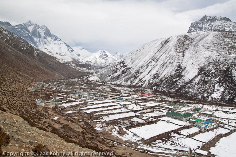 Am Nachmittag mache ich noch einen kleinen Akklimatisationsspaziergang. Blick von einer Anhöhe auf Dingboche und den oberen Talbereich des Imja Khola.