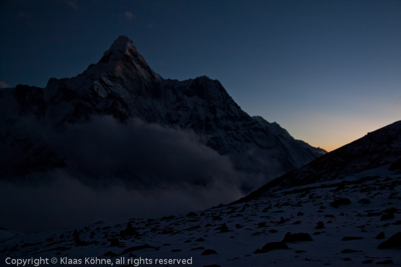 Der Vorhang fällt nach einem grandiosen Schauspiel. So lange wie möglich verzichte ich auf den Einsatz meiner Stirnlampe, weil damit schlagartig die magische Stimmung zerstört wäre. Erst kurz vor Chukhung schalte ich sie ein. Gegen sieben bin ich wieder in meiner Lodge. Zur Feier des Tages gönne ich mir "Vegetable Fried Potatoes" und natürlich meinen geliebten Milktea. Außer mir sind noch ein Franzosenpärchen und ein ziemlich stark hustender Koreaner da. Die Franzosen wollen morgen zum Basecamp des Island Peak, genau wie ich. Um halb neun geht ein ausgefüllter Tag zuende. Bin durchaus zufrieden mit mir und der Welt...