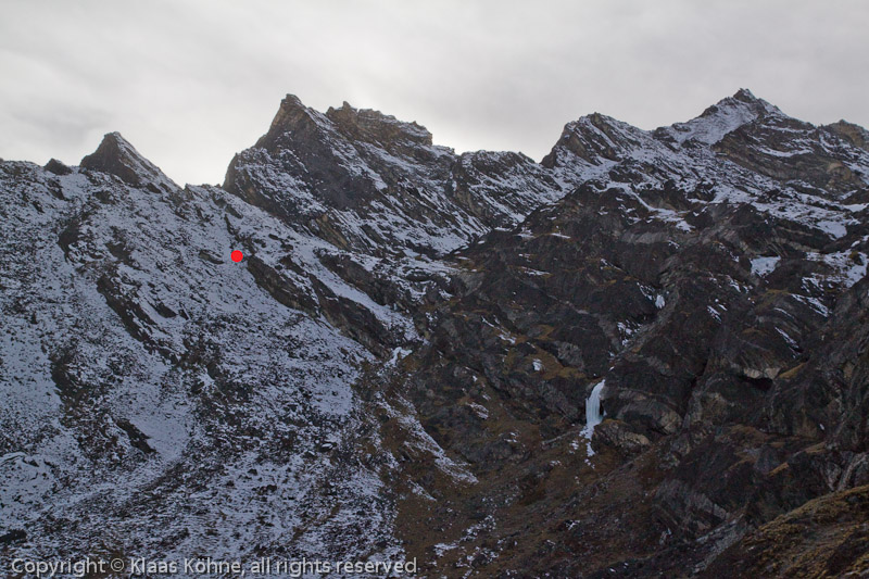 Runter ist aber auch kein Spaß. Rückwärts an der Wand entlang klettern geht praktisch nicht und die Hänge sind verdammt steil und rutschig. Verschneites Blockwerk, jeder Meter trügerisch. Ganz langsam taste ich mich mit den Stöcken abwärts. Bloß keinen Fehler machen. Wer weiß, wann hier wieder jemand entlang kommt. Da habe ich mich ja wieder mal ein eine tolle Situation reingeritten. Der dritte große Verhauer nach Junbesi und Nunthala. Mit dem Unterschied, dass ich hier knapp 3000m höher unterwegs bin - mit entsprechenden Folgen, wenn was passiert. Unendlich langsam kommt die querende Spur von vorhin näher. Nuptse und Lhotse schauen zu. Was mache ich hier eigentlich? Endlich, endlich erreiche ich um 16h02 die alte Spur. Oha, die letzte Stunde hatte es ganz schön in sich. Konzentriert weiter abwärts bis unten und dann auf der rechten Seite wieder hoch. Da wollte ich ja eigentlich sowieso entlang! Um kurz vor fünf habe ich den Rand des Plateaus erreicht. Blick zurück zu meinem Umkehrpunkt unterhalb des Poklade-Ostgipfels. Deutlich ist die diagonale Rampe nach links aufwärts zu sehen. Mann, was für ´ne Aktion! PS: Später habe ich herausgefunden, dass für die falschen Spuren niemand anderes verantwortlich war, als mein lieber Freund Philippe aus Frankreich...