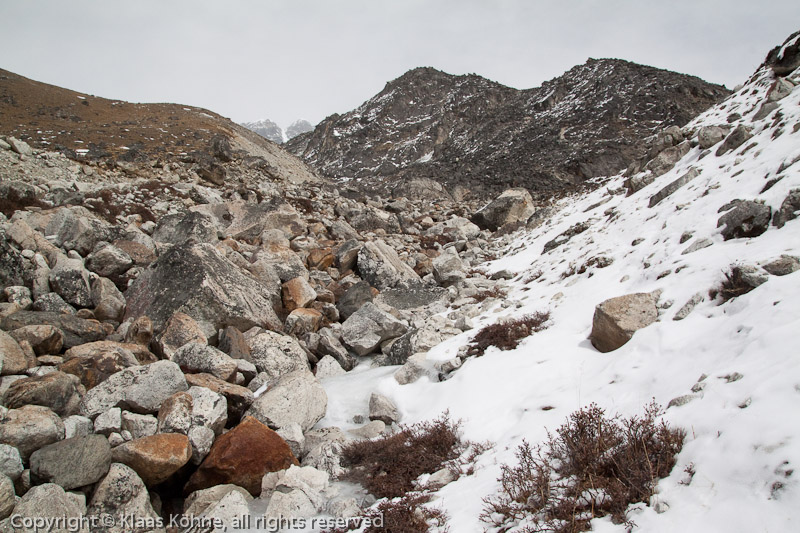 Ohne Weg und Steg geht es jetzt das Tal des Niyang Khola aufwärts. Ich hoffe, die Richtung stimmt ungefähr. Es geht wieder an die 5000m-Marke. Das Wetter wird nicht gerade besser...