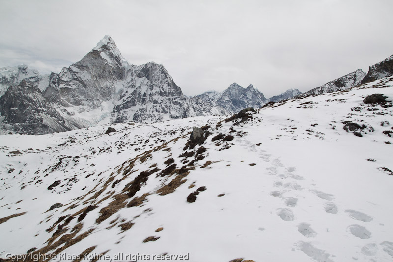 Ama Dablam, Kangtega und Spuren im Schnee auf gut 5200m.