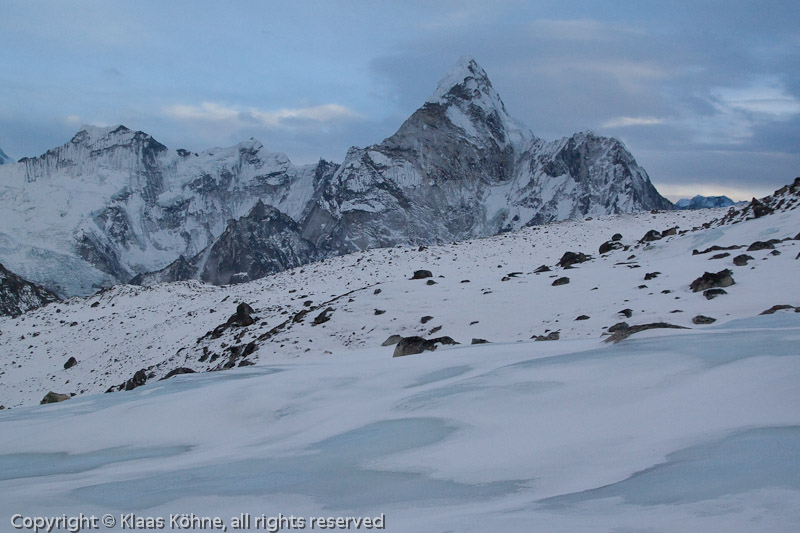 Die vereisten Kongma-Lakes mit der Ama Dablam im Hintergrund. Kurz nach sechs finde ich einen einigermaßen geeigneten Platz. Gar nicht so einfach, auf dem harten Boden das Zelt zu verankern. Um halb sieben ist es aber bezugsfertig. Nichts wie rein und die Hände aufwärmen. Tja, ein Kocher wäre jetzt nicht schlecht, aber ich habe mich ja bewusst für Kaltverpflegung entschieden ("Ist ja nur eine Nacht!"). Immerhin habe ich noch etwas heißes Wasser aus Chukhung und zur Feier des Tages gibt´s ein Bounty! Oh, Mann, bei der Aktion vorhin hätte leicht was passieren können. Dann wäre ich übel dran gewesen. Ich sollte mein Glück wirklich weniger strapazieren. Nur gelegentlich kommt etwas Wind - bitte so bleiben! Hoffentlich kriege ich meine Füße wieder warm. Höhe laut GPS: 5426m. Die Linsen müssen heute mal drinbleiben, sonst sind die morgen früh eingefroren. Kurz vor acht - mal sehen, ob ich etwas schlafen kann...