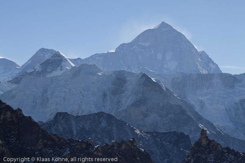 7.3.: Gelegentlicher Wind und heftig kalt aber insgesamt sehr ruhig - Glück gehabt! Trotzdem wieder ´ne Endlos-Nacht. Die Lust auf weitere Zeltnächte über 5000m ist ziemlich gesunken. Irgendwann wird es dann aber doch wieder hell und der Makalu grüßt herüber. Sofort geht´s mir wieder besser...