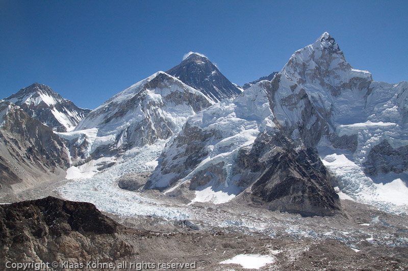 .. aber vor allem natürlich zu dieser hübschen Berggruppe: Links der Changtse (7553m), der schon komplett in Tibet steht, dann das schneebedeckte Dreieck der Everest-Westschulter (7205m), dann der Everest himself (8848m, gefällt mir besser als 8850m - man liest beides), dann ein Stück vom Kamm des Lhotse (8516m) und schließlich der Westgipfel des Nuptse (7879m), der von hier aus scheinbar der Höchste ist. Was für ein Ensemble!