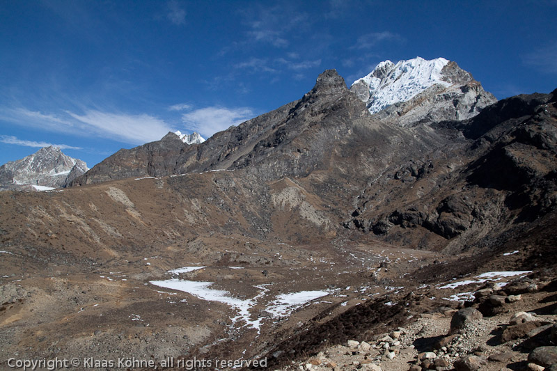 Runter in ein Seitentälchen und auf der anderen Seite wieder rauf. Darüber der Lobuche Peak (6119m).