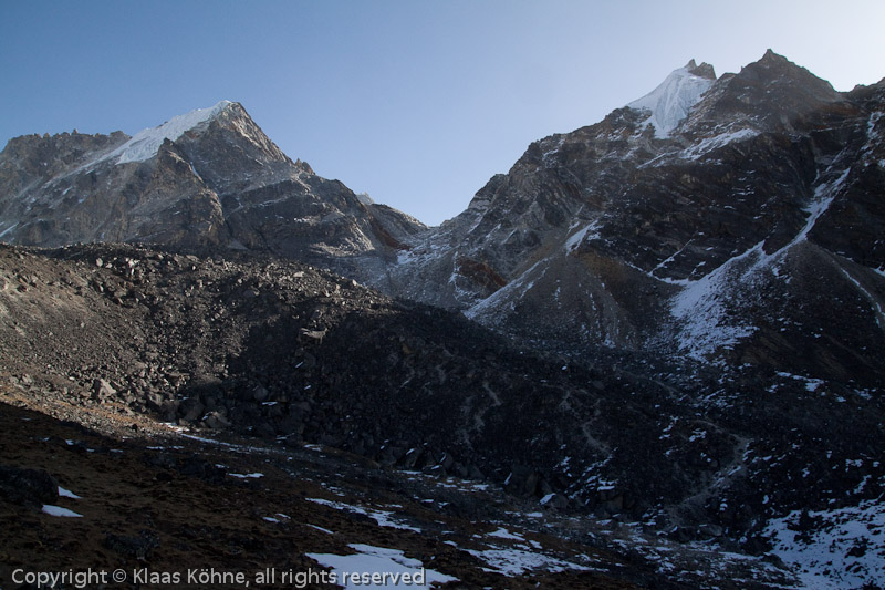 11.3.: Die Nacht ging zwar nicht gerade schnell vorbei, aber insgesamt war es besser als am Kongma La. Nochmal Zelten? Eher nicht, ist einfach noch zu kalt jetzt. Irgendwann wird es hell - hell, nicht warm! Bis die Sonne hierhin scheint, wird es noch ewig dauern. Ein paar Vögel machen Krach. Es gibt mein übliches Tsampa-Frühstück. Dann wurschtel ich mich in die eiskalten Schuhe, was immer einige Minuten dauert und selten ohne Fluchen abläuft. Auch der Zeltabbau gestaltet sich extrem nervig - die Häringe sind nämlich schön im Boden festgefroren. Ich bekomme sie nicht heraus bzw. sie brechen einfach ab, obwohl das die teuren Dinger von Hilleberg sind. Für die Hände ist die Prozedur auch nicht gerade schonend. OK - das Thema Zelten hat sich damit endgültig erledigt...
