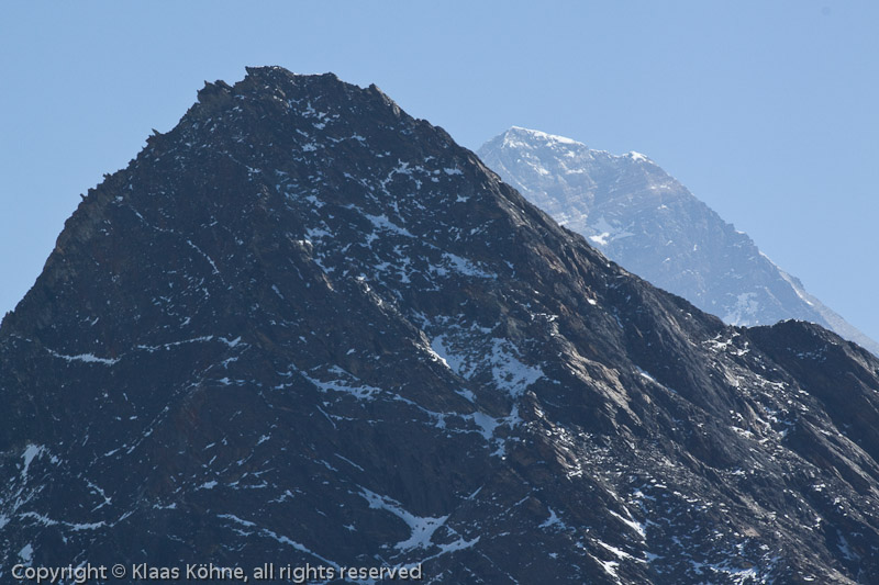 Der Mount Everest himself! Derzeit noch verdeckt von einem vergleichsweise unbedeutenden (5675m) Nebengipfel.