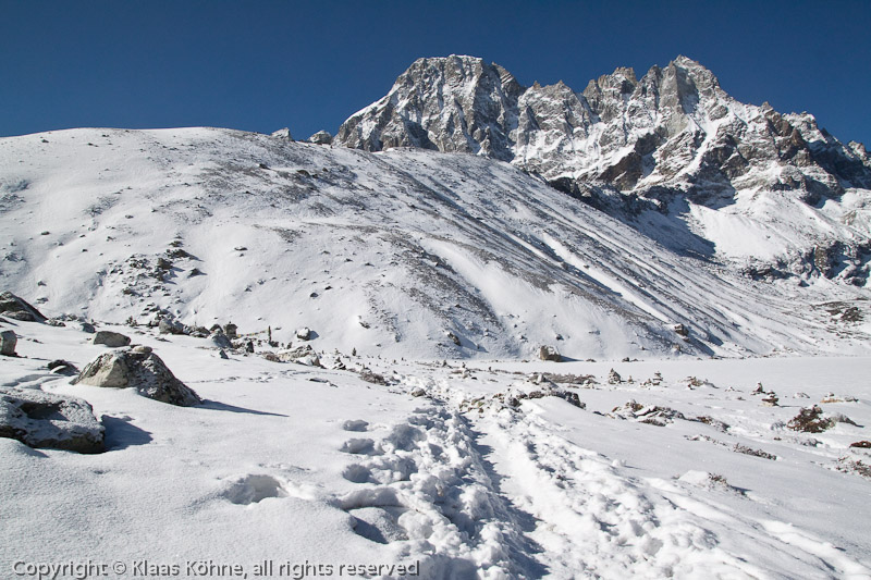 Mein Aufbruch verzögert sich wieder mal, weil ich genauso schlecht in die Eisstiefel reinkomme wie in den letzten Tagen. Das kann schon mal ´ne Veirtelstunde dauern. Um kurz nach acht komme ich los. Heute soll es abwärts bis nach Dole (ca. 4000m) gehen und danach wieder hierhin rauf. Im Vergleich zu den letzten Strapazen wird das heute also ein "Ruhetag". Zu Beginn ein schöner Winterspaziergang im glitzernden Schnee...