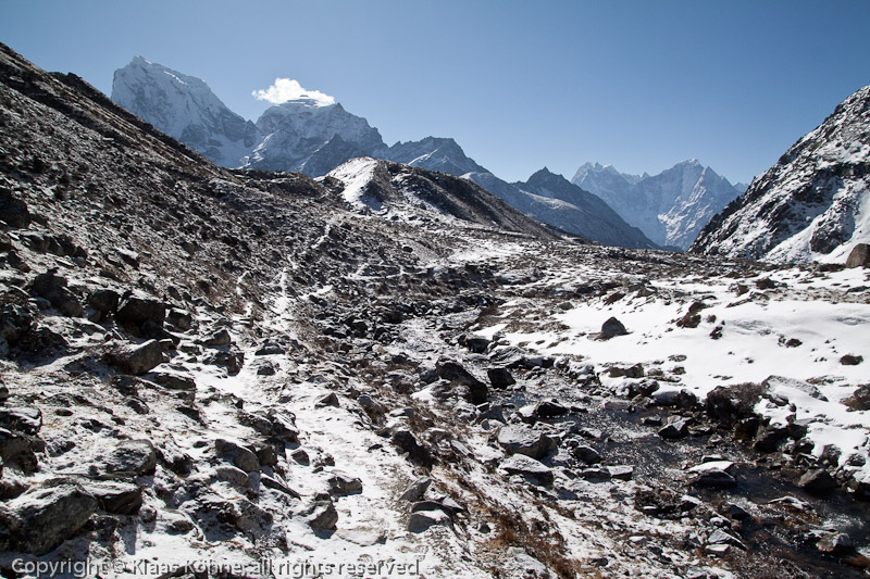 Über einen bequemen Weg neben einem Bacherl geht es auf Cholatse, Taboche, Kangtega und Thamserku zu.
