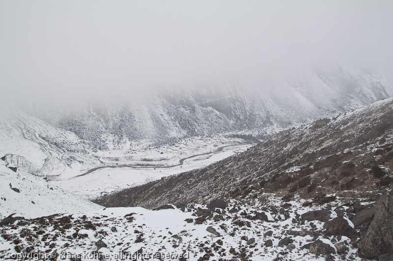 Aha, da unten ist das Haupttal des Bhote Kosi. Nach rechts geht es Richtung Tibet zum 5716m hohen Nangpa La. Da würde ich ja gerne nochmal raufgehen, die Strecke ist aber leider für Ausländer gesperrt. Naja, 2005 war ich ja schon von der tibetischen Seite dort.