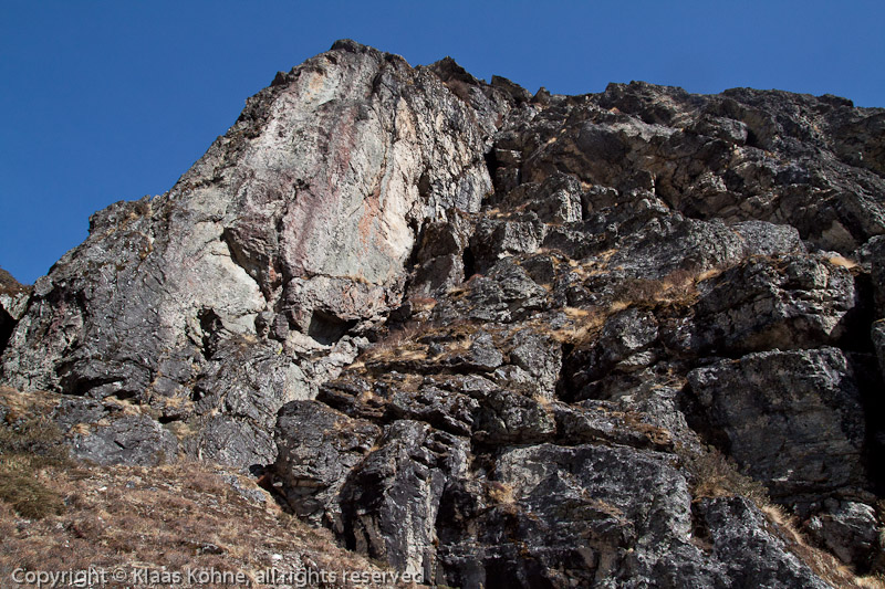 Blick hinauf zu einem markanten Felsen. Hoffentlich kommt da jetzt nichts runter...