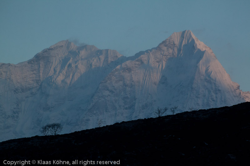 Um kurz nach vier bin ich wieder bei meiner Lodge und gönne mir einen "Sherpa Stew". Die Franzosen sind auch noch da. Kurz vor Sonnenuntergang gibt´s nochmal schönes Licht auf den Bergen. Dies ist der Kusum Kangguru (6369m). Später ist noch ein toller Sternenhimmel zu bewundern.