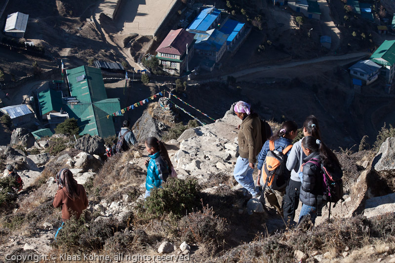 Gegenverkehr am Steilhang. Aus den oberen Dörfen Khunde und Khumjung kommen die Leute nach Namche runter, denn dort sind die Lodges, die Restaurants und die Läden.