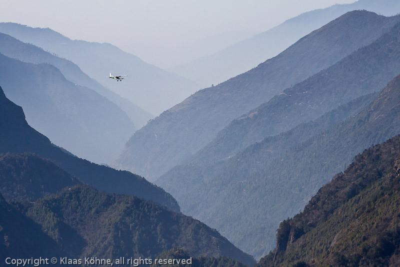 Flugzeug im Anflug auf Shyangboche. Neue Touristen und/oder Waren für Namche. Müsste ein ziemlich aufregender Flug sein. Und man könnte sich den langen Anmarsch sparen...